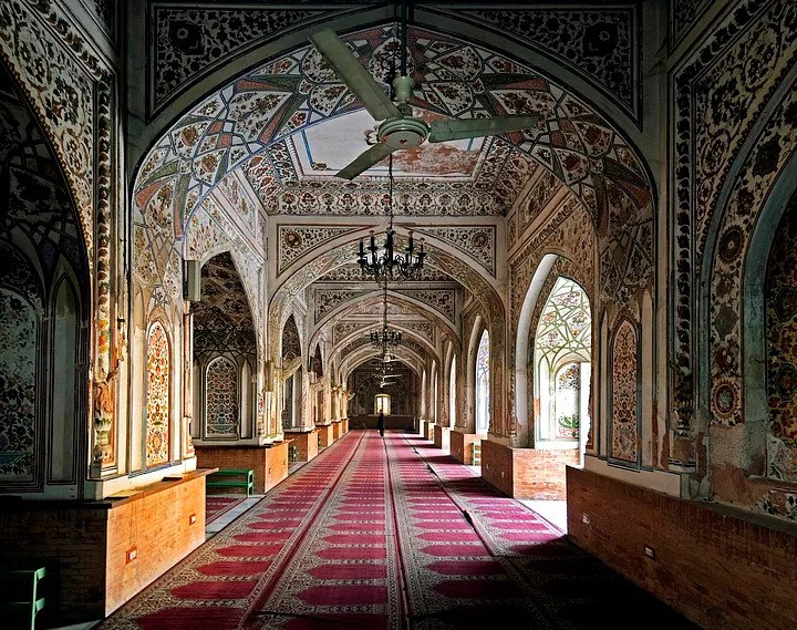 5 arched portals offer entry into the main prayer hall. The central arch is the tallest, and features cusped arches typical of the Mughal style. The central arch is flanked by two slightly shorter un-cusped arches that are designed in the Persian and Central Asian style. These arches are flanked by a smaller arch decorated in a similar style, and row of 7 small arched portals are found above the tip of each arch. The three central arched portals are embellished with muqarnas above the row of 7 mini-arched portals, while the outermost arches are instead decorated with ghalib kari, or a network of ribs made of stucco and plaster that are applied to curved surfaces in the archways for decorative purposes. Archways into the mosque are also flanked by vegetal motifs along their upper curves, which unlike the green motifs at Badshahi Mosque, are multi-coloured.
